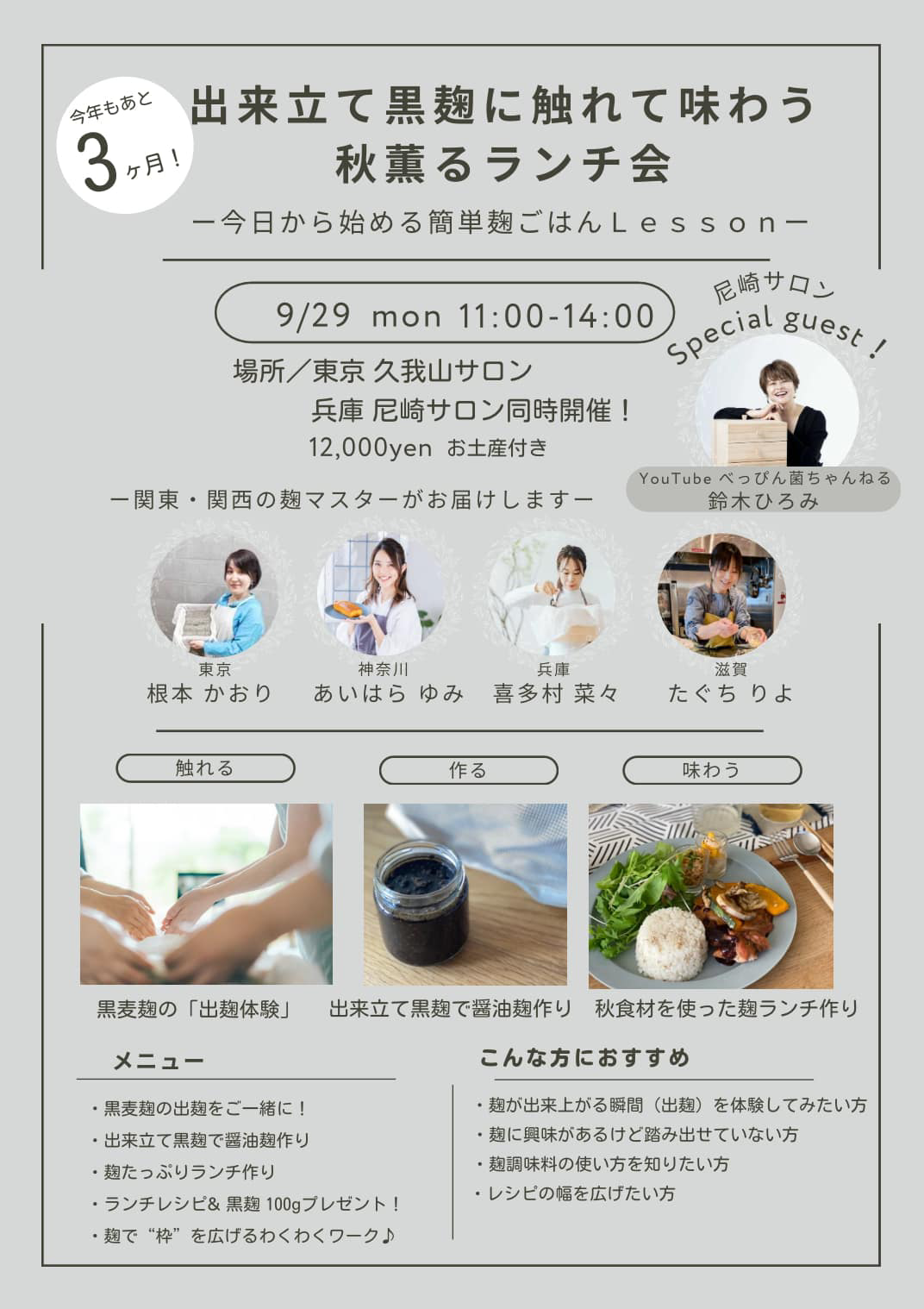 麹たっぷり季節のランチと発酵ワークショップ!東京&兵庫 同時開催!【日時詳細】日時:9/29(月) 11:00-14:00場所:東京 久我山サロン 兵庫 尼崎サロン⭐️市場では手に入らない! 出来立ての黒麹 & 黒麹で作る醤油麹 お持ち帰り🎵